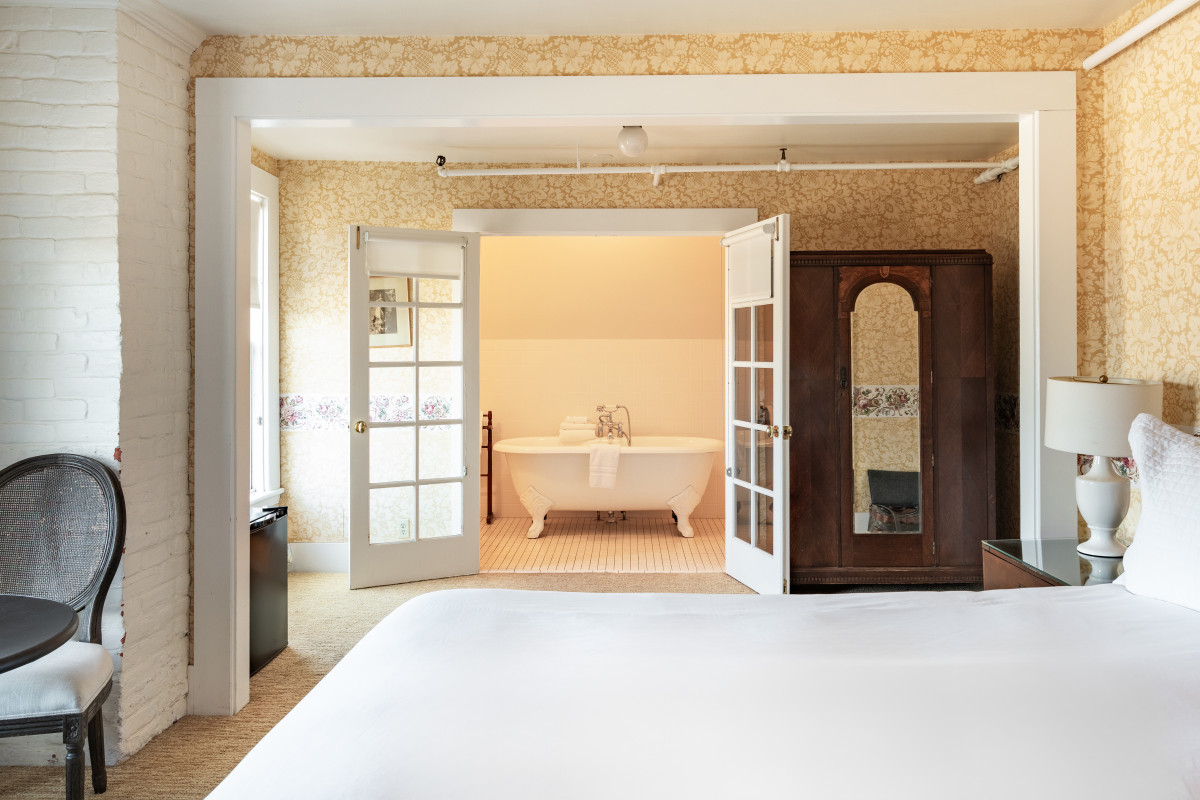 This romantic, second-floor room sits at the front of the Main House with ocean views out the two Victorian-era casement windows. Room 1 has a new California King bed with a down comforter and pillows, and luxurious bedding. The oversized claw-foot tub is perfect for two. The bathroom also boasts a separate step-in shower and natural Shikai bath and body products.
